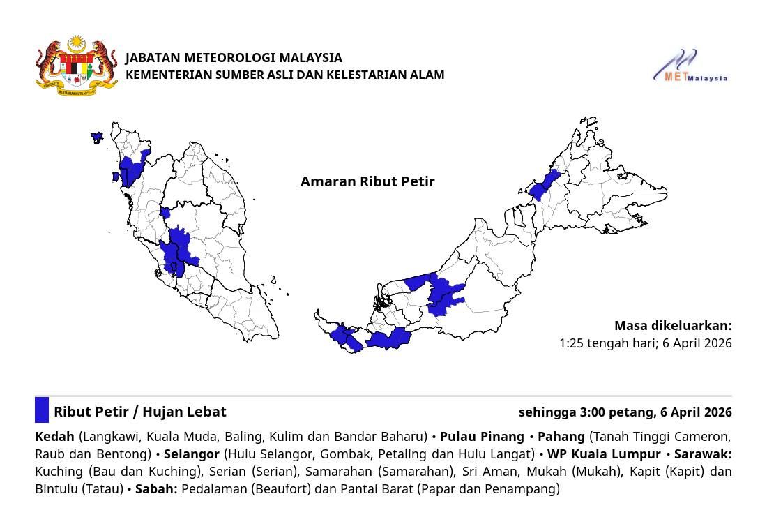 马来西亚气象局于今日下午1时25在官方脸书更新天气预报时表示,雪州受影响的地区有乌鲁雪兰莪、鹅唛、八打灵和乌鲁冷岳。