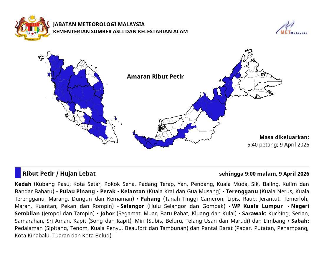 (莎阿南9日讯)狂风暴雨来袭!雪兰莪、吉隆坡和10个州属预计将迎来雷雨,直至今日晚上9时。