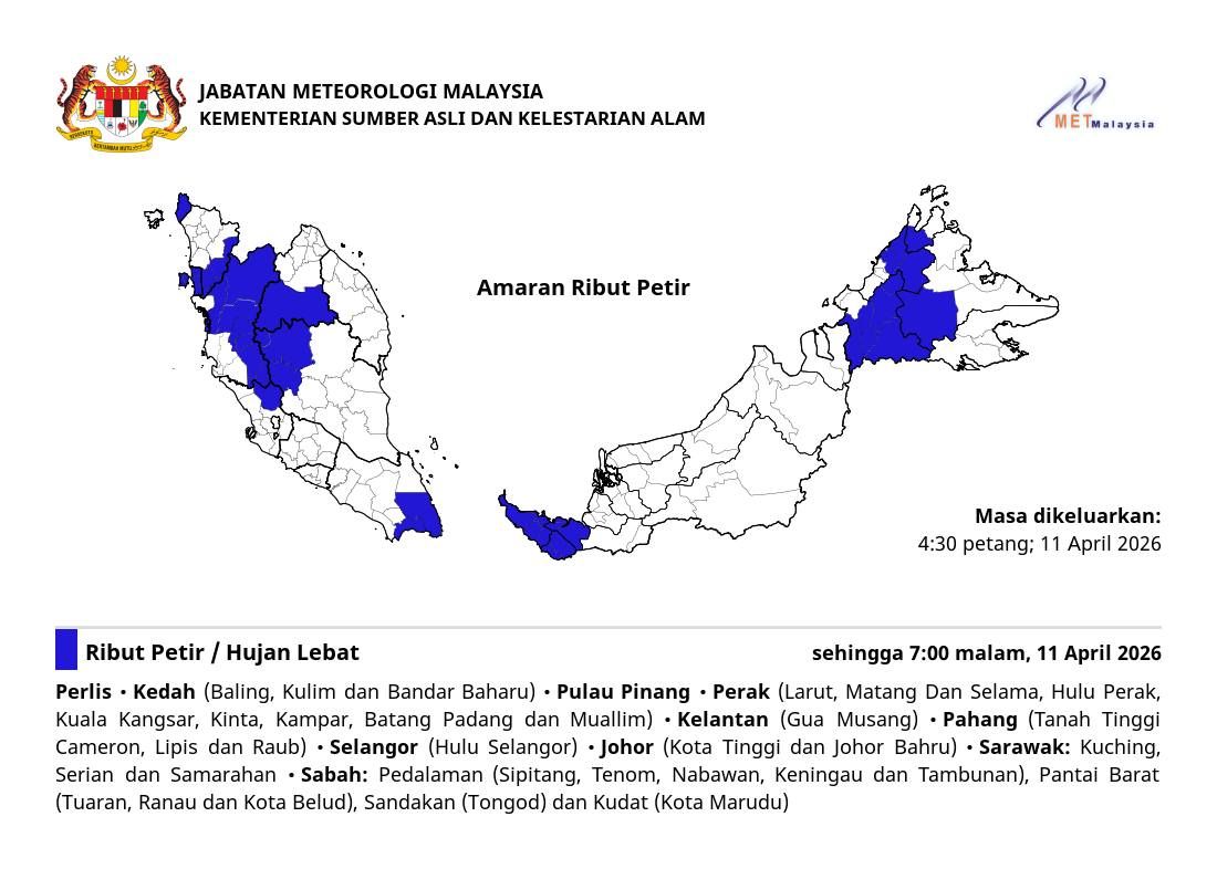 吉打、霹雳、吉兰丹、彭亨、柔佛、沙巴和砂拉越则是局部地区,预计会有雷雨直至今日晚上7时。