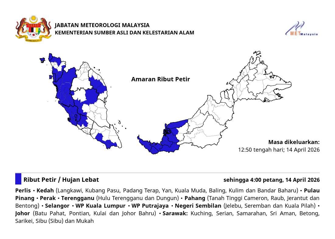 (莎阿南14日讯)雷雨持续!整个雪兰莪、吉隆坡、布城和全马来西亚9个州属,预计持续迎来雷雨,直至今日下午4时。