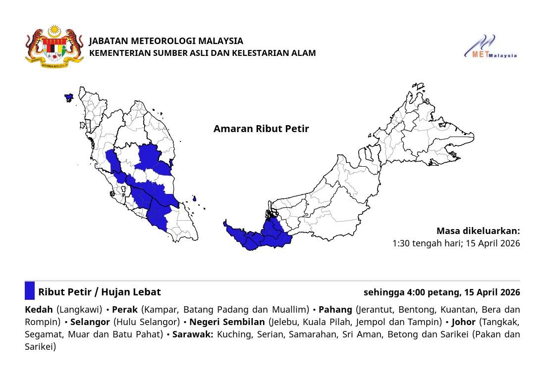 (莎阿南15日讯)雪兰莪与全马来西6个州属预计将迎来雷雨天气,持续至今日下午4时。
