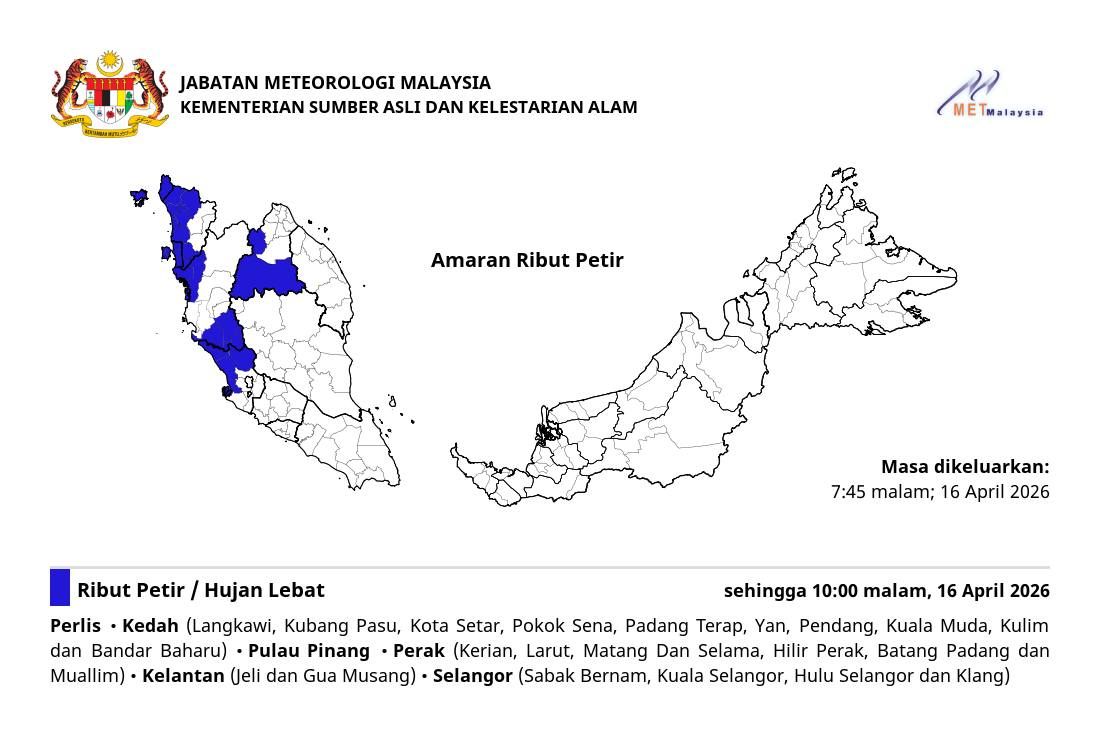整个槟城和玻璃市也受到恶劣的天气影响;至于吉打、霹雳和吉兰丹则是局部地区预计有雷雨直至今日晚上10时。