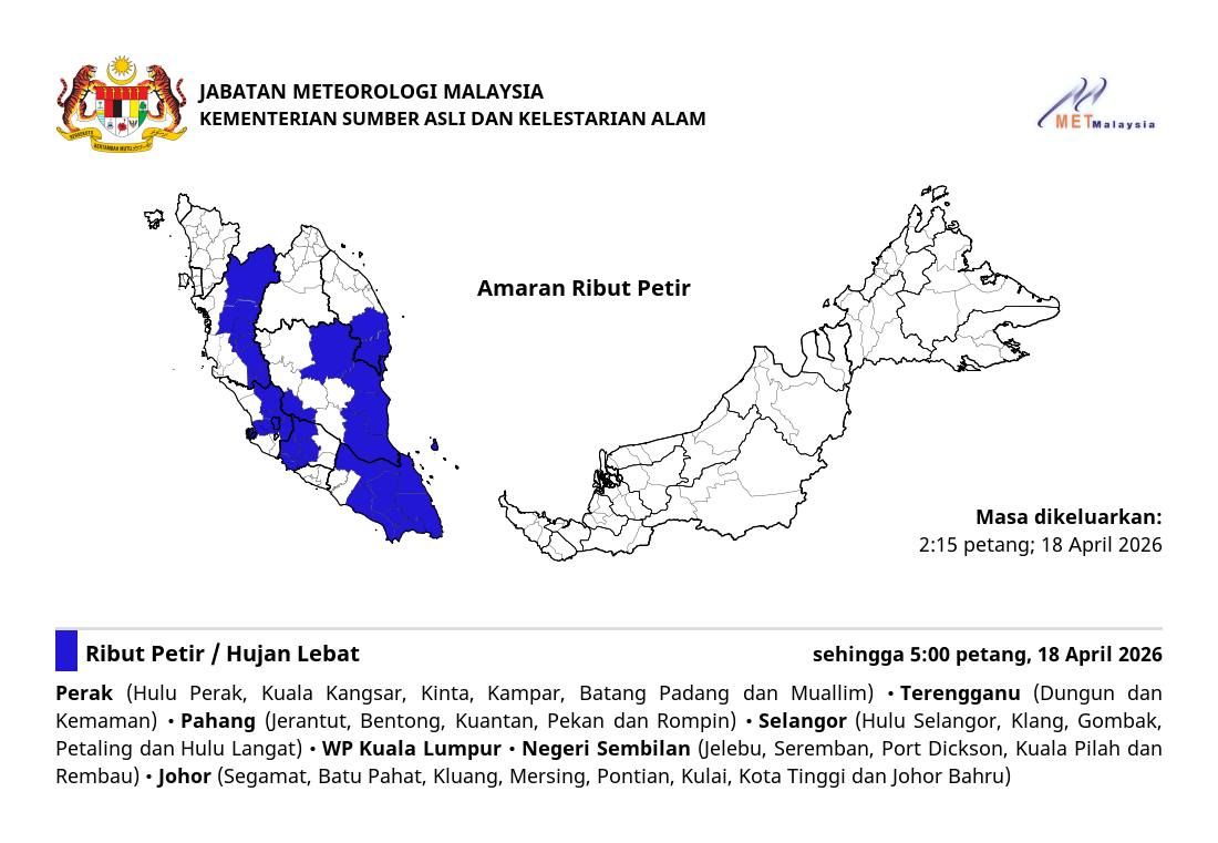 (莎阿南18日讯)雪兰莪州与吉隆坡多个地区,预测有雷暴、强风和豪雨出现,直至今日下午5时。