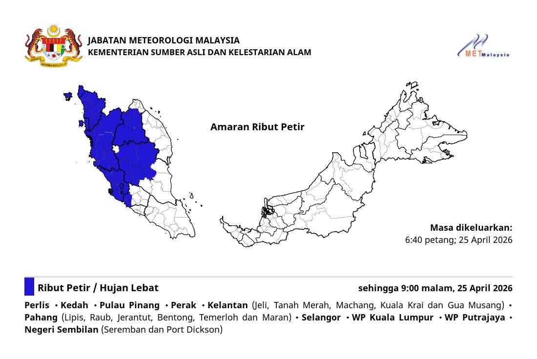 马来西亚气象局于今日下午6时40在官方脸书更新天气预报时表示,整个玻璃市、吉打、槟城、霹雳、雪州、吉隆坡和布城都将受到恶劣的天气影响。