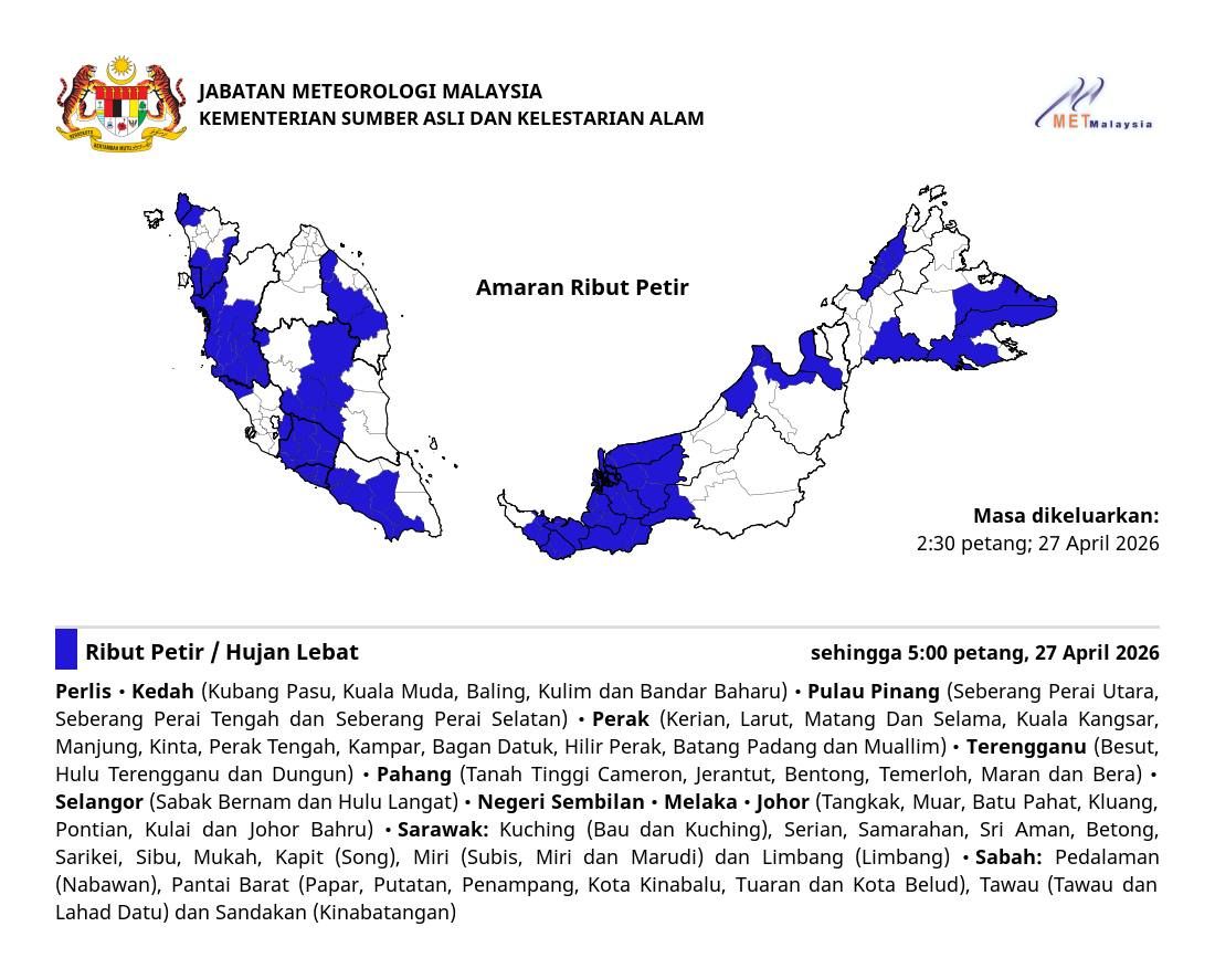 (莎阿南27日讯)狂风暴雨来袭!雪兰莪两个县区与全国多个州属,预计持续迎来雷雨,直至今日下午5时。