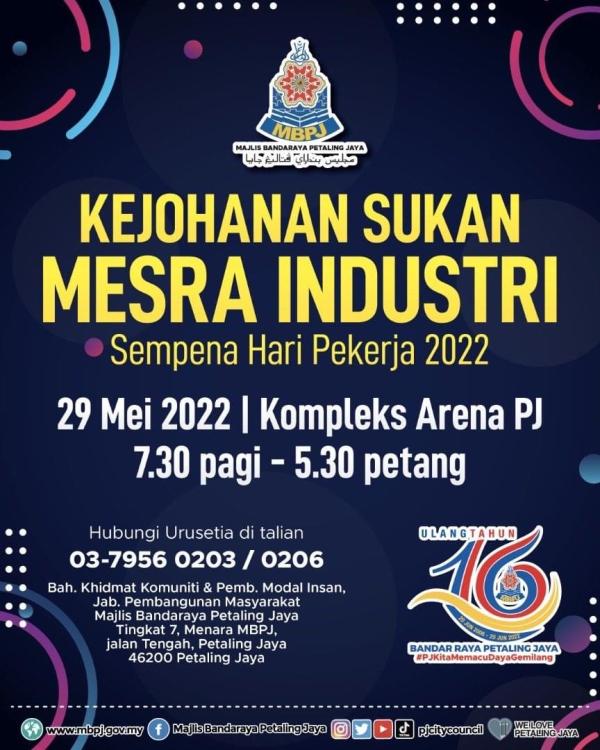SHAH ALAM, 13 MEI: Majlis Bandaraya Petaling Jaya (MBPJ) menganjurkan Kejohanan Sukan Mesra Industri 2022 sempena Hari Pekerja pada 29 Mei depan.